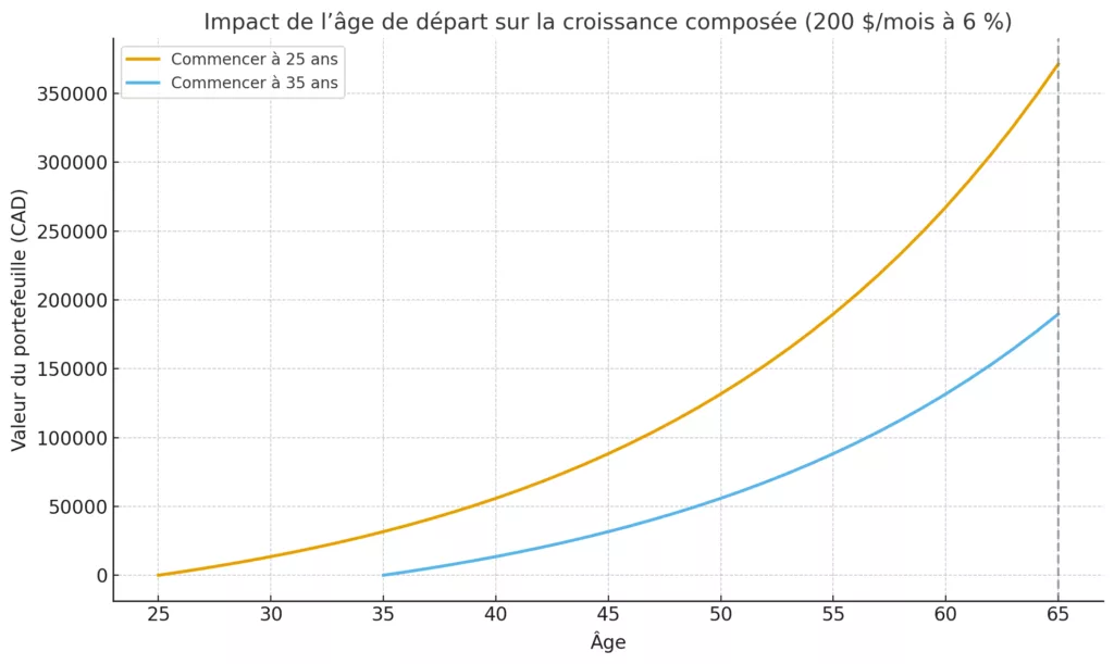 Plus vous commencez tôt, plus l’intérêt composé a le temps de travailler pour vous. Même de petites sommes peuvent croître de façon impressionnante.